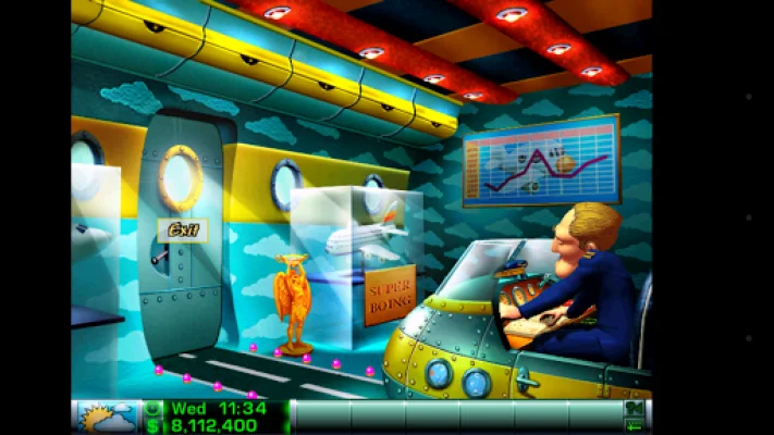 The game features a funny economy simulation in a comic style, allowing players complete freedom to manage their airline and explore over 30 different locations. This includes purchasing airplanes and their fittings, planning routes, managing personnel, and implementing marketing strategies. Players can also construct their own airplanes and use security measures to protect against competitors' attacks or even sabotage their rivals.