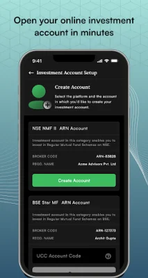 The Akshar Investment app is a user-friendly and efficient tool that allows clients to easily onboard themselves and make investments in just 10 minutes. It also features an interactive goal planning module that helps track the progress of financial goals. The app also offers the convenience of accessing personal data and investment accounts for family members, as well as mandate information, all from the profile page.