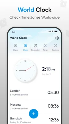 The app's main features include an alarm clock, world clock, timer, stopwatch, and bedtime reminders. Users can set multiple alarms with custom sounds and vibration options, as well as choose repeat days and add unique labels to each alarm. The app also offers fun wake-up missions to ensure users never oversleep.