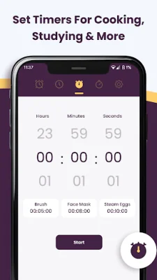 For those who need to time specific tasks or activities, the app also offers a timer feature. Whether you're cooking, working out, or need to stay focused for a set amount of time, you can set timers with precision and ease. The countdown can even run in the background, and you'll receive a clear notification when time is up.