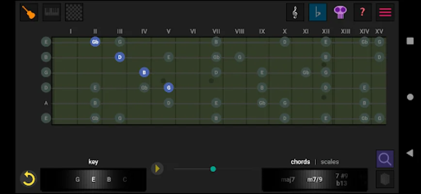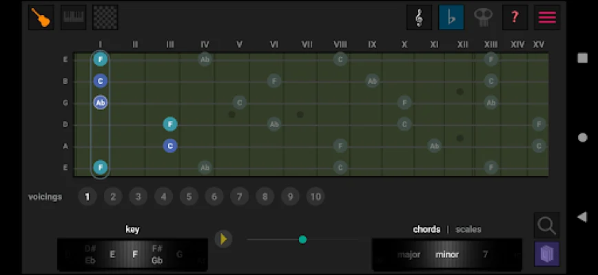 In addition to these main features, the app also offers left-handed guitar support, the ability to switch between sharp (#) and flat (b) keys, and display enharmonic equivalents. It also includes classical notation in the treble clef and 8 basic chords and 6 standard scales for beginners. The systematic display of chords and scales in a matrix, intervals at a glance, and comparison of harmonic structure make this app a valuable tool for musicians.