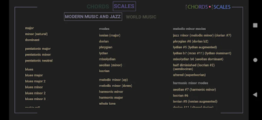 The scale section includes 66 modern music and jazz scales, such as melodic minor modes and pentatonic scales, in all guitar positions. It also offers 61 world-music scales, including Arabic, Chinese, and Indian scales. Similar to the chord section, users can switch between guitar and piano displays for each scale.