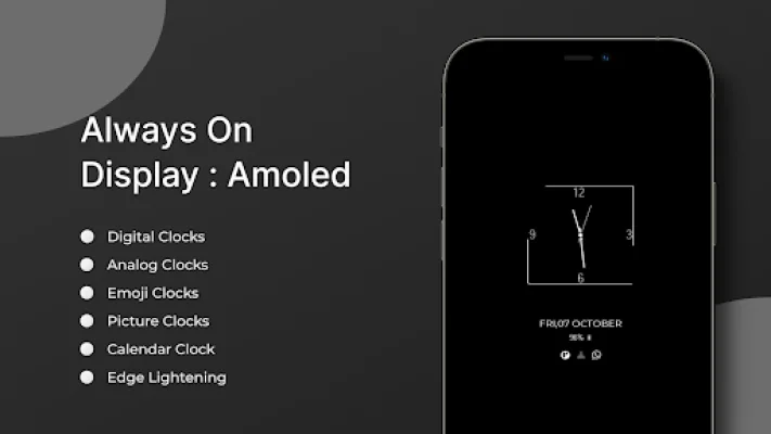 This application is a clock display that will always be on your phone's screen. It shows the time, date, day, and battery percentage. The display uses Super AMOLED technology, which only turns on the necessary pixels to show the clock and other information, saving battery life.