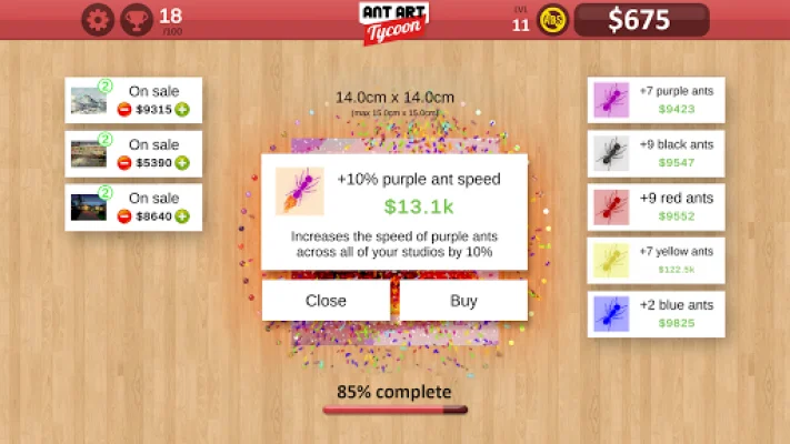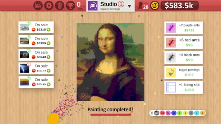 As you tap your way to success, you can also level up and upgrade your ants' art skills. With each level, you'll get closer to becoming a well-known name in the art world. And with the ability to sell as many paintings as you can, the sky's the limit for how much money you can make in this idle clicker game.