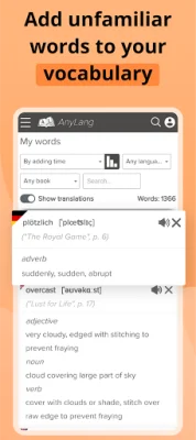This application is a language learning tool that allows you to easily translate words and phrases with just one click, saving you time and effort. It combines dictionary entries and contextual translation to provide a comprehensive understanding of the word. You can also add unfamiliar words and phrases to your vocabulary and review them at your convenience. By immersing yourself in original content, you can effectively and quickly learn any language.