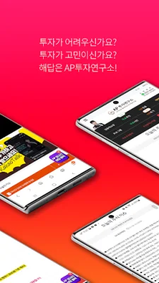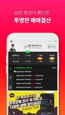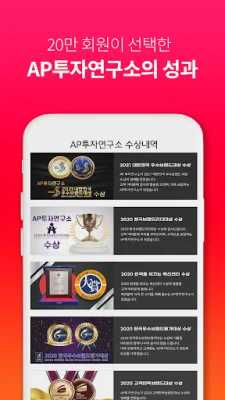 AP투자연구소는 김용재 소장이 운영하는 투자 관련 애플리케이션입니다. 김용재 소장은 20만명의 회원과 15만명의 유튜브 구독자를 보유하고 있으며, 매일 아침 직접 무료로 관심 종목을 운영합니다. 이를 통해 매일 아침 성공적인 투자를 위한 정보를 무료로 제공합니다. AP투자연구소는 안정적인 성과를 유지하고 있으며, 2021년 7월 기준으로 1년 이상 투자한 고객들의 월 평균 수익률은 15.22%를 기록했습니다. 코로나 변동장세를 겪으면서도 AP투자연구소만의 투자전략을 통해 회원님들의 안정적인 투자와 결과를 만들어냈습니다. AP투자연구소는 투명한 매매결산을 제공합니다. 수익률은 20만 회원이 모두 확인할 수 있도록 실시간으로 공개되고 있으며, 거짓된 수익률로 증명할 수 없습니다. 이는 고객에 대한 책임감과 AP투자연구소의 자신감을 나타냅니다. 또한 AP투자연구소는 오늘의 주식 이슈를 제공합니다. 주식시장의 모든 이슈를 한눈에 제공하며, 개장 전, 장 중, 장 마감 등 투자자에게 꼭 필요한 실시간 시장 정보를 제공합니다. 또한 종목 분석, 시장 분석 등 다양한 정보를 유튜브와 연동하여 투자 판단에 도움을 드립니다. 이를 통해 회원님들의 투자를 더욱 더 효율적으로 이끌어낼 수 있습니다.