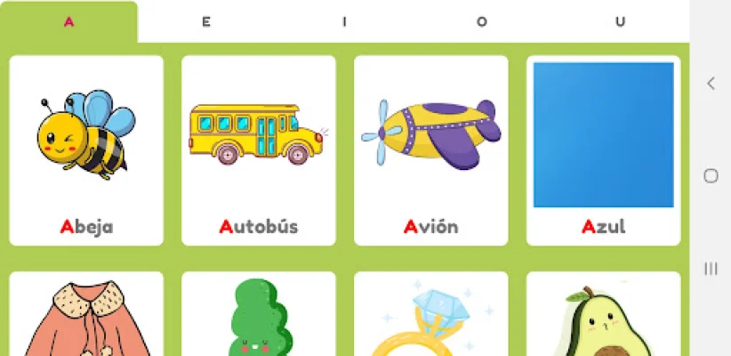 Además, la aplicación también incluye actividades como "¿Qué letra falta?" donde los niños deben completar palabras faltantes con la vocal correcta, y "¿Qué palabra empieza por A?" donde se presentan imágenes y los niños deben elegir la palabra que comienza con la vocal indicada.