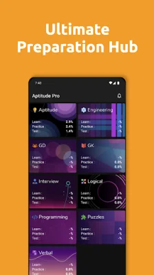 Aptitude Pro is an all-in-one app designed to help individuals prepare for various types of tests and interviews. It covers a wide range of topics including aptitude, engineering, interview preparation, group discussion, general knowledge, logical reasoning, programming, puzzles, and verbal communication. With over 16,000 easy-medium offline questions, users can learn with tricks and formulae, practice, and test their skills in both timed and untimed modes. The app also offers daily practice reminders and a distraction-free ad experience. One of the key features of Aptitude Pro is its comprehensive coverage of topics, making it a valuable resource for students, job seekers, and professionals. It supports preparation for exams such as GMAT, LSAT, CAT, SAT, MAT, IBPS, Civil Services, and specialized exams like NIFT. It also helps with assessments of rationality and logical skills like DLR (data logical reasoning). Additionally, the app offers preparation for advanced placement exams, LSAC, TET, and clerk exams. The app's user-friendly design and detailed solved analysis and user reports make it easy for individuals to track their progress and identify areas for improvement. Users can also save questions and solve them later, as well as provide feedback on questions. With sub-topics included in each category, users can focus on specific areas of study and tailor their preparation to their needs. The aptitude section covers a wide range of topics such as age, average, percentage, profit and loss, time and distance, and more. The engineering section includes topics like bio-technology, chemical, civil, CS/IT, electrical, electronics, instrumentation and control, and mechanical. The interview preparation section offers guidance for both freshers and experienced individuals, as well as tips for behavioral, guesstimate, phone, and stress interviews. Other features of Aptitude Pro include group discussion topics, general knowledge questions on various subjects, and logical reasoning exercises. The programming section covers languages like C++, Java, Python, and more, while the verbal communication section includes topics like antonyms, synonyms, and sentence correction. Overall, Aptitude Pro is a comprehensive and user-friendly app that can help individuals take the first step towards achieving their career goals. With its vast catalog and various features, it is a valuable tool for anyone preparing for aptitude exams and interviews.