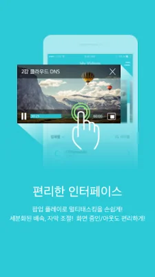 주요 기능으로는 버튼 조작이 필요없는 제스쳐 기능이 제공됩니다. 이를 통해 기본 Seek, 멀티터치 줌 기능, 볼륨 동작, 화면 밝기 조절, 화면 사이즈 조절, 팝업창 사이즈 조절 등을 할 수 있습니다. 또한 동시작업이 가능하도록 팝업 재생 기능이 제공되어 다른 작업이 필요한 경우 팝업 플레이로 전환할 수 있습니다. 기본에 충실한 모바일 플레이어 기능도 제공됩니다.
