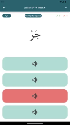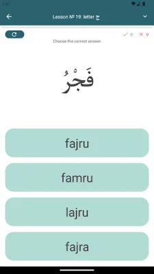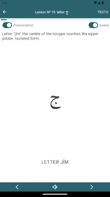 When you first open the app, you will see a list of lessons with a circle next to each title indicating your test results in percentage. Each lesson also includes a test to check your understanding of the material. Our app follows the order of letters taught in the well-known textbook "Muallim sani," which can be viewed by selecting the "Alphabet" menu item.