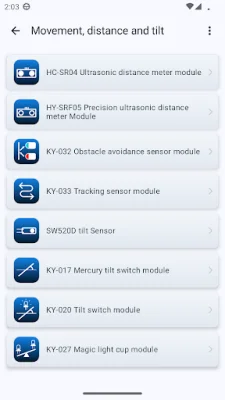 The hardware examples covered in the app include LEDs, buttons, serial ports, motors, timers, sensors for light, distance, vibration, temperature, humidity, and more. It also includes modules for sound, displacement, infrared, magnetic fields, touch, tracking, flame detection, and heartbeat sensing. Additionally, there are examples for LED modules, buttons, joysticks, and relays.