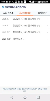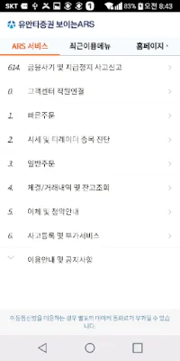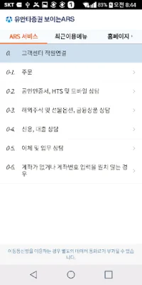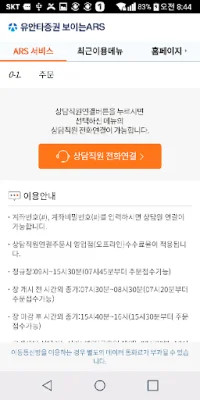 유안타증권의 고객센터 ARS 애플리케이션은 화면을 통해 메뉴를 선택할 수 있어 더욱 빠르고 편리하게 이용할 수 있습니다. 최근 이용한 메뉴를 확인하고 바로 상담직원이나 ARS에 연결할 수 있는 최근 이용 메뉴 기능도 제공합니다. 하지만 이용 시 유의해야 할 사항이 있습니다. 보이는 ARS를 이용할 경우 이동통신망을 통해 별도의 데이터 통화료가 부과될 수 있으며, 이용자의 환경이나 통신 상태가 원활하지 않을 경우 음성 ARS만 이용할 수 있습니다. 이 애플리케이션을 설치할 때는 "보이는 ARS 서비스"를 제공하기 위해 서비스사인인 (주)콜게이트에 전화번호와 앱 푸쉬 정보를 제공해야 합니다. 이 정보는 동의 철회 시까지 보유 및 이용되며, 동의하지 않을 경우 해당 서비스를 이용할 수 없습니다. 또한 보이는 ARS 서비스를 이용하기 위해서는 고객님의 정보 제공 동의와 권한 설정이 필요합니다. 동의 후 서비스를 원하지 않는 경우 고객 센터로 연락하면 됩니다. 이용 동의가 필요한 정보는 다음과 같습니다. 제공 목적은 보이는 ARS 서비스 이용이며, 제공되는 정보는 휴대전화번호와 앱 푸시 ID입니다. 이 정보는 (주)콜게이트가 보유하며, 동의 철회 시까지 이용됩니다. 접근 권한 세부 사항 중 필수적인 접근 권한은 전화 기능입니다. 이는 기기 정보와 고객 지원 센터 전화 걸기 서비스 등을 이용하기 위함입니다.