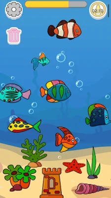 As users progress through levels, they can unlock new aquarium decorations such as shells, corals, seaweed, castles, and sea stars. Each completed drawing fills the progress bar and brings users closer to unlocking new aquariums. The app also allows for customization of the underwater scene by placing objects on the aquarium floor.