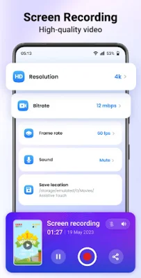 For those in need of professional screen recording, this application offers a no-root option with no time limit or watermarks. You can customize the video resolution, bitrate, and frame rate, and even record internal and microphone audio. All recordings are automatically saved to your device's album.