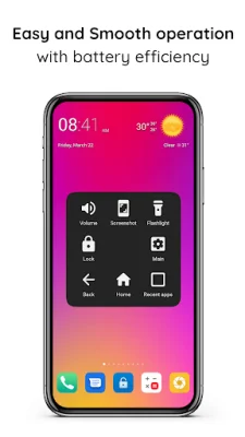Assistive Touch for Android is an application that provides a convenient menu for users to access various settings and functions on their device. This menu includes options such as navigating to the home screen, opening recent applications, taking screenshots, and adjusting settings like Wi-Fi, Bluetooth, and volume. The app also offers features like locking the screen, changing the keyboard, and launching apps or shortcuts (which will be available in a future update).