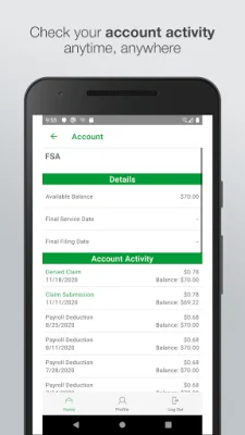 Once logged in, the app provides you with all the necessary details regarding your health benefits. You can quickly check your available balances at any time, 24/7. The app also offers charts that summarize your account(s) for a better understanding of your benefits. Additionally, you can view any claims that require receipts and easily contact customer service through a simple click to call or email option.