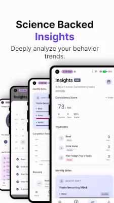 Deep habit analytics and insights are also available, with 30-day trend graphs and a consistency score to track progress. Users can also see their performance breakdown by time of day, view a weekly habit heatmap calendar, and see their top habits in a leaderboard. The app also offers momentum and recovery speed indicators, as well as the ability to track who the user is becoming through identity votes.