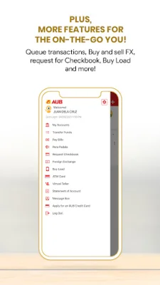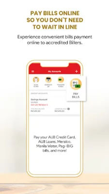 Bills payment is also made easier with the AUB Mobile App. Clients can conveniently pay their bills online to accredited billers, avoiding the hassle of waiting in line. The app also serves as a virtual teller, allowing clients to queue their transactions ahead of time and use AUB's Fast Lane when visiting a branch.