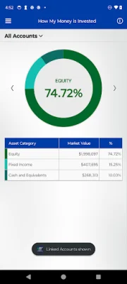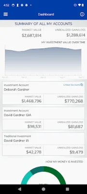 This application is designed to provide users with a comprehensive overview of their investment accounts. It includes a dashboard that summarizes the market value of their investments and how their money is currently allocated. This allows users to easily track the performance of their investments and make informed decisions about their financial portfolio.