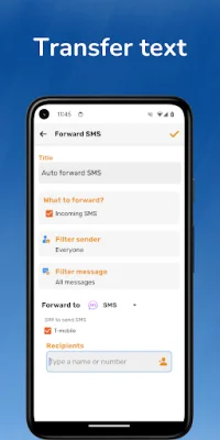 The core feature of this application is Auto Forward, which allows users to transfer SMS messages and phone calls to other devices based on user-defined rules. This feature works by detecting incoming SMS messages or phone calls and then applying the specified rules to forward the details to other devices. Users can choose to forward SMS and calls to another phone via SMS or to a computer via email. They can also create their own rules by filtering senders and keywords, and add multiple recipients per rule.