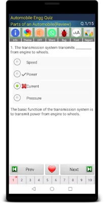 Automobile Engineering Quiz app is a unique and innovative learning tool created by Sana Edutech for Android devices. It offers a fast and user-friendly interface for students to access learning materials. The app features a rich user interface with categorized questions, making it easy for users to navigate and find the information they need. One of the key features of this app is the ebook, which is designed with a fast user interface and allows users to seek pages and even has a voice read-out facility. This makes it convenient for users to access the information they need quickly and easily. The app also has an automatic pause-resume feature for quizzes, allowing users to pick up where they left off and revisit the page they stopped at. The app offers both timed quizzes and practice mode quizzes, giving users the option to test their knowledge under pressure or at their own pace. After completing a quiz, users can review their answers against the correct answers instantly. The app also provides a detailed evaluation report of all quiz results, which is properly stored and categorized for easy access. This app is not only beneficial for students pursuing a degree in Automobile Engineering, but also for anyone who is interested in evaluating their knowledge or learning new things about automobiles. It covers a wide range of topics such as internal combustion engines, engine construction, wheel assembly, fuels and supercharging, fuel supply system, cooling and lubrication systems, chassis and transmission system, steering and front axle, braking system, automotive electrical system, alternative energy sources, emission control methods, electric and conventional vehicles, engine performance parameters, testing of automobile engines, and non-conventional engines. Overall, the Automobile Engineering Quiz app is a comprehensive and convenient learning tool that offers a fun and interactive way to learn about automobiles. With plenty of questions loaded, users can have fun while expanding their knowledge on this subject. Whether you are a student or simply interested in automobiles, this app is a must-have for anyone looking to enhance their understanding of this field.