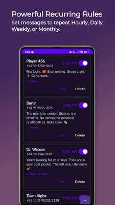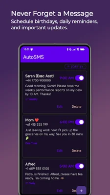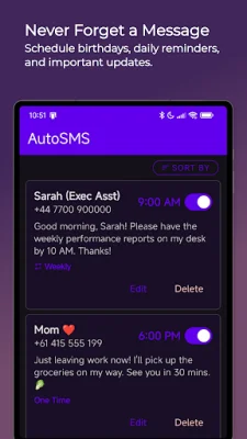 So why should you choose AutoSMS? Well, for starters, it's a clean and simple app that is easy to use. It also offers a variety of useful features that can make your life easier. For example, you can set up yearly recurring messages for important dates like birthdays and anniversaries, ensuring that you never miss a special occasion. You can also use it to send reminders to yourself or others about upcoming events or tasks. And for business purposes, you can automate routine follow-ups or status updates to clients.