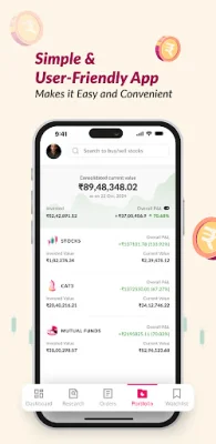 The app boasts several key features that make investing effortless and efficient. These include the ability to invest with just one click or swipe, access to expert research and recommendations for long-term growth, and a complete investment hub for various types of trades and mutual funds. Additionally, the app offers effortless portfolio management, smart search and quick order placement, and simplified analysis tools to help users stay on top of their investments.