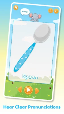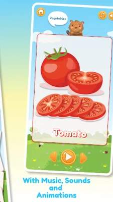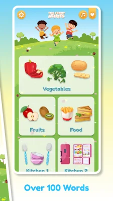 This application is designed to make learning vocabulary and language skills easy and exciting for babies, toddlers, and preschoolers. It features a simple interface where users can select a category and review flashcards with colorful and high-quality pictures. The app also includes fun animations, sounds, and engaging voice-overs with professional pronunciation to keep children entertained and interested in learning. The categories available include vegetables, fruits, food, breakfast, and kitchen items.