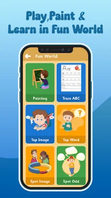 In addition to the educational content, the app also offers a "Fun World" section with interactive learning games. These include letter tracing to develop fine motor skills, a virtual slate for free drawing and practicing, and quizzes to test their knowledge and reinforce learning.
