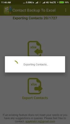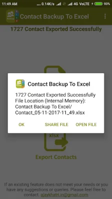 To export your contacts, simply click on the export icon and the app will create an excel sheet with all of your contacts. The file will be saved in a folder called "Backup Contacts To Excel" in your phone's memory. From there, you can easily share the excel file via email or transfer it to your PC.