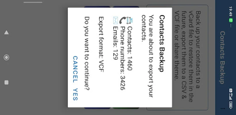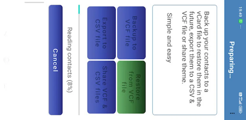 This application allows you to easily backup and share your contacts to popular cloud storage services such as Google Drive and Dropbox. This means that you can access your contacts from any device and never have to worry about losing them. The app also offers a progress bar with a percentage indicator and a cancel option, making the backup process more transparent and customizable.