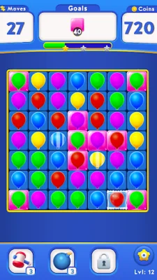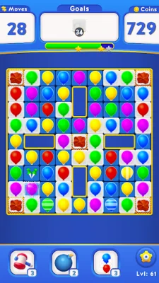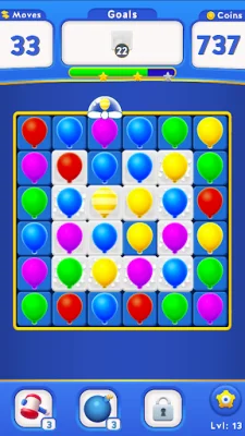 The game features special balloon pop items that can help players clear levels more easily. These include striped balloons that clear entire rows when matched vertically or horizontally, packaged balloons that explode nearby balloons when matched in T or L shapes, multicolor balloon bombs that destroy all balloons of the same color when matched in a row, and time bombs that must be popped before time runs out.