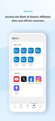 Furthermore, the app allows users to directly connect with the Bank of Korea's official social media channels, such as YouTube, Twitter, Facebook, and Instagram. This feature enables users to stay updated on the latest news and announcements from the central bank through various social media platforms.