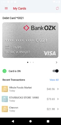 In addition to these features, Bank OZK Cards also offers the convenience of conducting card-related mobile transactions at any time of the day. This includes real-time balance inquiries and locating ATMs. Overall, this application provides numerous benefits, including the ability for all cardholders to receive alerts and actively monitor their transactions, as well as giving parents the ability to remotely control and monitor their children's spending.