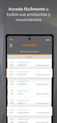 En la aplicación Empresas Banreservas, podrás realizar diversas acciones relacionadas con tus productos y servicios bancarios de manera rápida y sencilla. Una de las principales ventajas es que podrás acceder a la vista de tus balances sin necesidad de ingresar tu contraseña, lo que te permitirá tener una visión general de tus finanzas de forma ágil y segura.