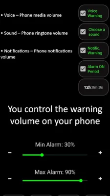 The app offers three types of alerts - voice alert, audible warning, and alert notification. You can control the volume of these alerts on your phone, with separate options for voice alerts, sound alerts, and notification warnings. If your phone is on silent mode, the app will still alert you, giving you the option to either turn up the volume or turn off the alarm.