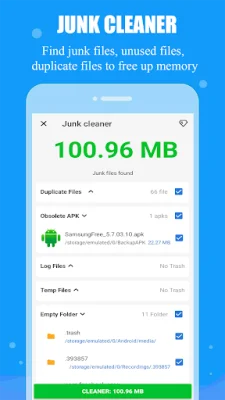 The Junk File Cleaner function is another useful feature that helps users free up space on their device by finding and deleting unnecessary files such as cache files, residual files, old apk files, and ad files. This not only helps improve the device's performance but also saves storage space.