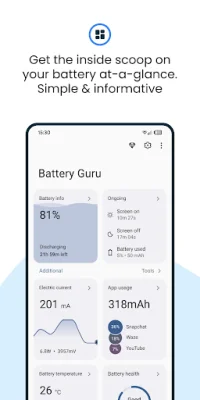 Battery Guru is an application that helps you keep track of your device's battery life. It offers a variety of features that make it easy to monitor your battery usage and health. The app is available in over 30 languages and is constantly updated to meet the needs of its users. One of the main reasons to use Battery Guru is its user-friendly interface and convenient features. With just one click, you can access all the information you need about your battery, including screen-on time, battery temperature, and health. The app also allows you to set alarms for specific battery levels and receive real-time usage statistics. Unlike other battery apps, Battery Guru provides comprehensive battery information as soon as you open the app. This includes details such as battery usage, electric current, voltage, and power. The app also takes into account the impact of temperature on battery health and displays it in a graph over time. Additionally, it offers deep sleep and awake metrics to help you understand idle drain. Battery health is an important aspect of battery life, and Battery Guru helps you keep track of it. The app estimates your battery's current condition and capacity compared to when it was new. It also provides tips to maintain good battery health and has a dedicated section for this feature. Another useful feature of Battery Guru is the battery alarm. You can set personalized alarms for different situations, such as low battery level, full charge, and high power usage. These alarms can help you develop better charging habits and prevent unexpected shutdowns. Battery Guru also learns about your device's power usage habits and provides more accurate measurements over time. This feature is constantly improving, and all the data used for learning and estimations can be found in the app's history section. If you need any help with Battery Guru, you can easily contact the support team through various channels, including their website, Telegram channel, and social media profiles. The app is designed to prioritize its users and provide them with the best experience possible. So, if you want to keep track of your battery life in a simple and efficient way, Battery Guru is the perfect app for you.