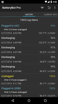 BatteryBot is an application that helps you monitor and manage your device's battery life. It displays your battery charge level as an icon in your status bar, along with other important information such as time remaining, temperature, health, voltage, and time since plugged or unplugged. It also offers a 1x1 app widget for easy access. The Pro version includes additional features like user-configurable alarms, logs, and a larger widget.