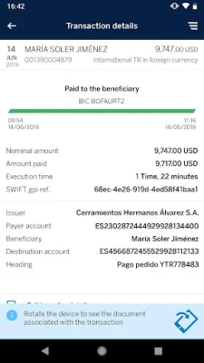 This application allows users to easily manage their bank accounts and transactions. It offers a variety of features such as consulting account information, signing pending orders, and initiating transfers. Users can also manage and validate their own operations, as well as receive notifications for important events such as overdrafts, pending orders, and pending operations. The app also includes a branch locator and a contact section for users to easily get in touch with their bank.