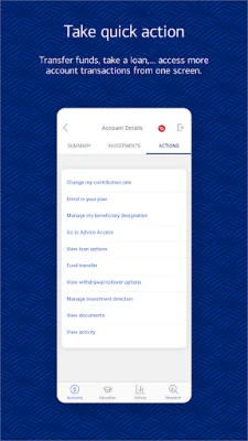The Benefits OnLine® app for Android allows you to easily manage your financial accounts, access important financial information, personalize your experience, and stay secure. With this app, you can check your account balances, holdings, and history, as well as manage your investments and update contribution rates. You can also view your Account Summary with interactive graphics and request loans, withdrawals, or rollovers.