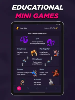 Make sure to log in every day to receive special surprises with the daily rewards feature. This adds an extra element of excitement and encourages you to keep coming back to the app. In addition to the mini-games, BestSkins also offers activities created by the app team and partners. These activities vary in difficulty and provide even more opportunities for you to have fun and earn rewards.