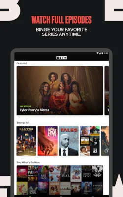 The BET NOW app is a convenient and easy-to-use platform for watching exclusive content and livestreaming BET shows. With this app, you can catch up on the latest episodes of popular TV series like Tyler Perry's Sistas, Tyler Perry's House of Payne, and BET News specials. You can also receive notifications for new episodes and other updates on the go.
