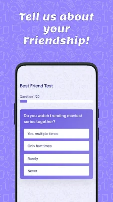 Discover the magic of friendship like never before with the BFF Test - Quiz For Friends App! Step into a world where your friendship is celebrated, cherished, and put to the ultimate test. Unveil the mysteries of your bond as you embark on a captivating journey filled with laughter, surprises, and heartfelt moments that will leave you feeling closer than ever before.