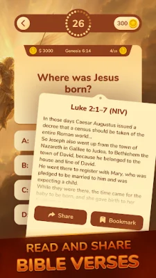 The app can be played anytime, anywhere, even without an internet connection. This makes it perfect for playing during travel, quiet time, or morning devotion. Each question brings you closer to understanding God's Word and living by His wisdom. So why not join believers around the world and let your faith shine through knowledge? Download Bible Trivia now and start your journey of fun, faith, and learning the Word of God, one question at a time. Please note that the prizes and money in the game are virtual and added for fun and excitement.