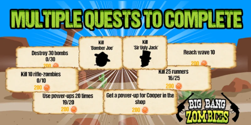 The premise of Big Bang Zombies is simple: you are a Sheriff tasked with taking down a horde of zombies that have taken over the town. Armed with your weapon, you must navigate through various levels and complete tasks in order to progress. But be warned, the zombies are not your only enemy - there are also powerful villain bosses standing in your way. Can you defeat them all and save the town from certain doom?