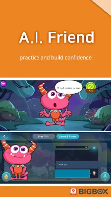To further improve fluency, BIGBOX also provides 1,200 English expressions to practice making sentences based on the collected flashcards. Users can also practice speaking with the app's AI friend, Monty, through activities like Listen & Repeat and Free Talking.