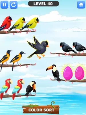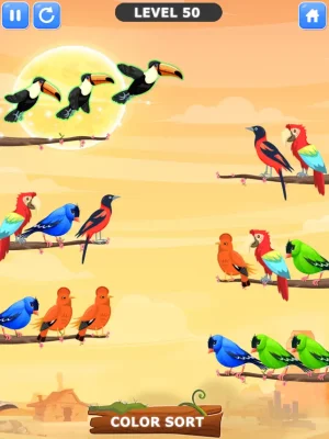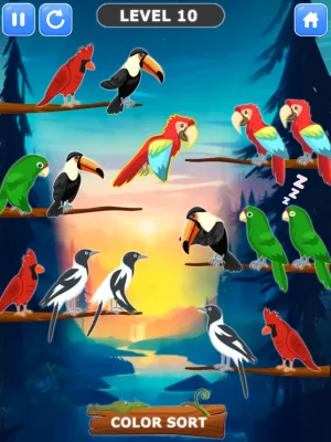 In summary, this application offers a unique and colorful bird sorting game with challenging levels and a variety of features. It's easy to play, but requires focus, skills, and strategy to successfully complete each level. With a variety of bird species to discover and a relaxing gameplay experience, this game is perfect for exercising your brain and relieving stress. So why not give it a try and become a master at sorting colorful birds?