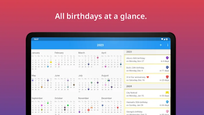 The app also offers a widget feature, which allows users to access their upcoming birthdays directly from their device's home screen. This eliminates the need to open the app every time a user wants to check for upcoming birthdays.