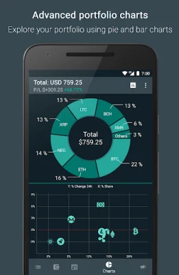 This application offers a comprehensive solution for tracking the ever-growing cryptocurrency market. With almost 2000 cryptocurrencies to choose from, including popular ones like Bitcoin, Ethereum, and Litecoin, users can easily keep track of their investments. The app also provides basic and full portfolio charts, allowing users to get a clear overview of their profits and losses. They can choose between a faster, more basic overview or a more detailed list of coins, and even see how their portfolio is distributed through advanced pie and bar charts.